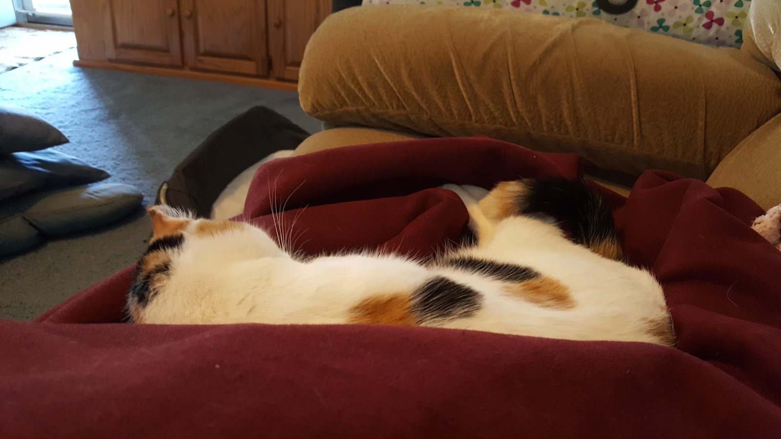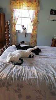 Look at you two lolling around on the bed! Oh, that made me laugh. The crew here always springs right up when I try to catch them napping!